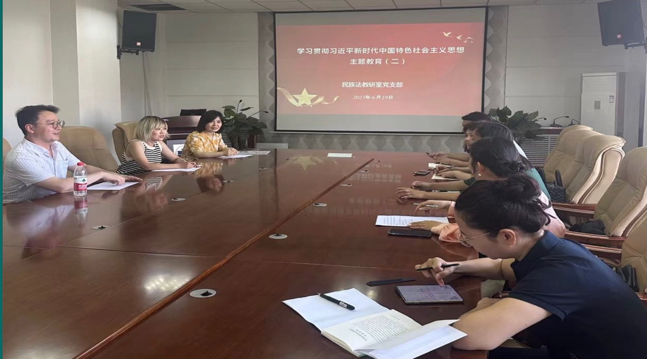 6月19日,88足球直播 民族法教研室党支部开展主题教育,支部教师党员在图书馆四楼会议室进行集体学习,党外人士闫德华老师列席参加。全体党员就《习近平著作选读》(第一卷)、《习近平新时代中国特色社会主义思想专题摘编》、《高举中国特色社会主义伟大旗帜为全面建设社会主义现代化国家而奋斗》(党的二十大报告),以及《中国共产党章程》中的部分内容进行了学习。