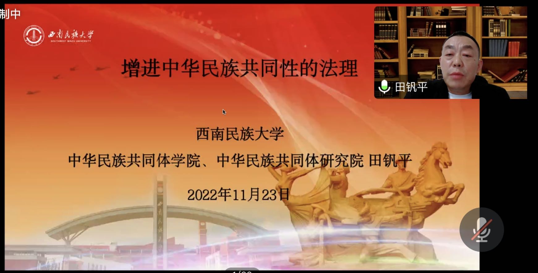 为深入学习二十大精神,增进铸牢中华民族共同体意识的理论认知和学理阐释,2022年11月23日,民族法党支部组织“二十大精神”系列讲座之《增进中华民族共同性的法理探析》。本次讲座特邀西南民族大学中华民族共同体学院副院长田钒平教授主讲,88足球直播 副院长、民族宗教研究院院长宋海彬教授主持,民族法党支部全体教师及校内外广大师生一百余人参加。
