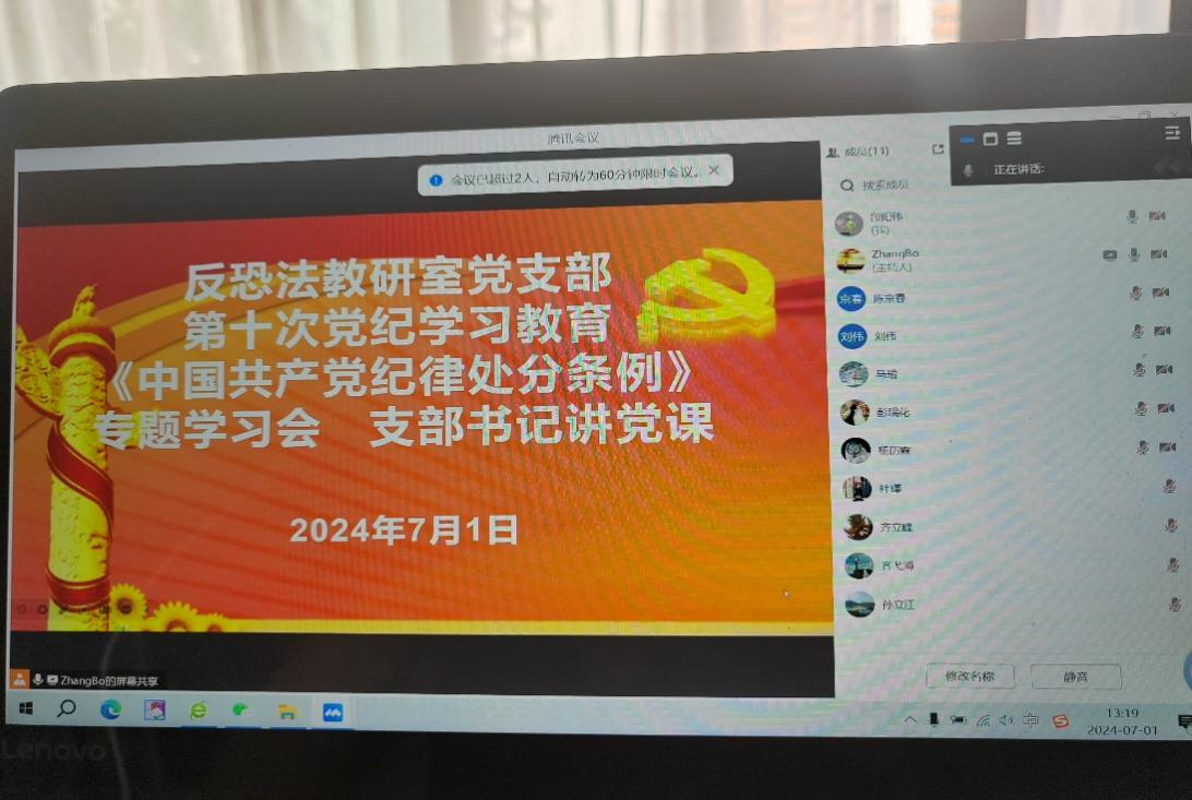 7月1日上午,88足球直播 反恐怖主义法教研室党支部在线上召开党纪学习教育专题研讨会暨支部书记讲党课活动。会议由党支部宣传委员段阳伟主持,支部全体党员参加会议。