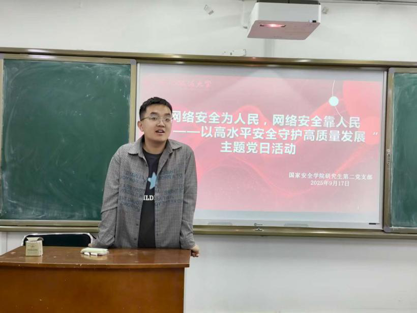 为深入学习贯彻习近平总书记“网络安全为人民,网络安全靠人民”的重要指示精神,增强网络安全意识,9月17日中午,88足球直播 研究生第二党支部组织开展网络安全宣传周主题党日活动。会议由支委成员魏嘉贺主持,支部全体党员参加。