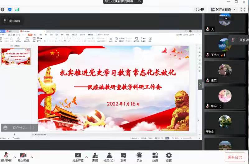 1月16日晚上,按照学院党委理论学习中心组线上学习会议的安排部署,民族法教研室党支部召开线上学习教育专题会议。党支部全体教师参加会议,会议由支部书记古丽那尔·乌斯曼江主持。