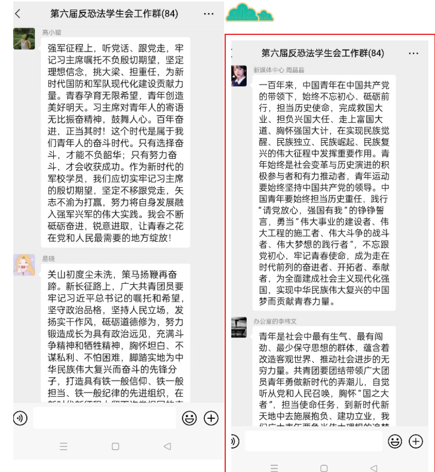 通过学习习近平总书记给中国航天科技集团空间站建造青年团队、南京大学的留学归国青年学者回信,同学们更加清晰地认识到青年承担新时代重任的战略地位,深刻理解当代青年与新时代同向同行、与实现第二个百年奋斗目标宏阔征程完整契合,并纷纷发言表示要树立家国情怀,立志接续奋斗、永久奋斗,努力成为实现中华民族伟大复兴的先锋力量。