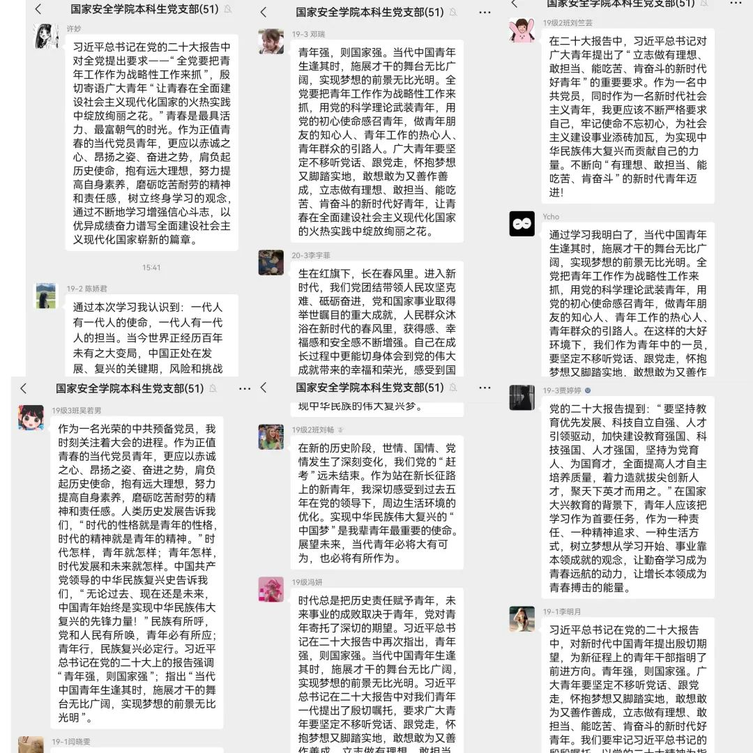 会议最后,全体党员一同观看习近平总书记在党的二十大中对青年寄语的相关视频,进一步明确了当代青年的使命和任务,习近平总书记在报告中对新时代广大青年赋予了殷切期待,给广大青年在奋斗的道路上打了一针强心剂。本科生党支部党员们感悟到作为青年应以党的二十大精神为指引,用坚定的理想信念照亮人生道理,用伟大的中国梦激扬青春梦想,努力争做新时代模范青年。