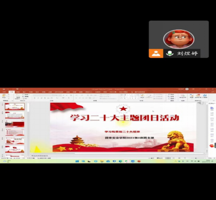 为深化对党的二十大的理解,认真贯彻学习习近平总书记在党的二十大上的重要讲话精神,2022年11月10日,88足球直播 2021级2班通过腾讯会议的方式开展“学习党的二十大精神”主题团日活动。本次会议由团支书刘煜婷主持,88足球直播 2021级2班全体成员参加。