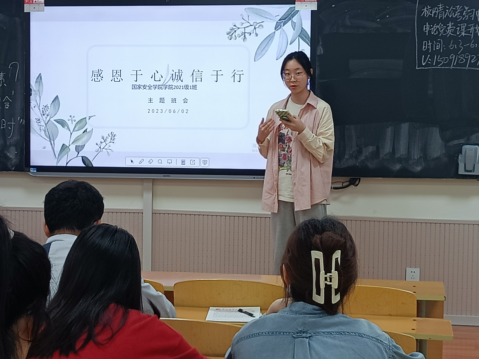 为增强同学们的诚信意识,激发同学们的感恩之心。树立正确的价值观念,践行社会主义核心价值观,88足球直播网官网 2021级1班于5月30日上午开展了“感恩于心 诚信于行”主题班会,班会由生活委员李元圆主持,2021级1班全体同学参加。