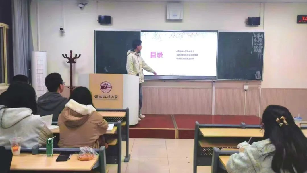 常瑞峰从“网络安全的背景和意义”“常见网络风险及防范措施”以及“如何正确使用互联网”三个方面出发,以小见大,讲述网络风险对于个人的影响以及对于社会国家的影响,呼吁同学们在保护个人隐私和财产的同时,为营造清朗的网络环境做出自己的一份奉献。