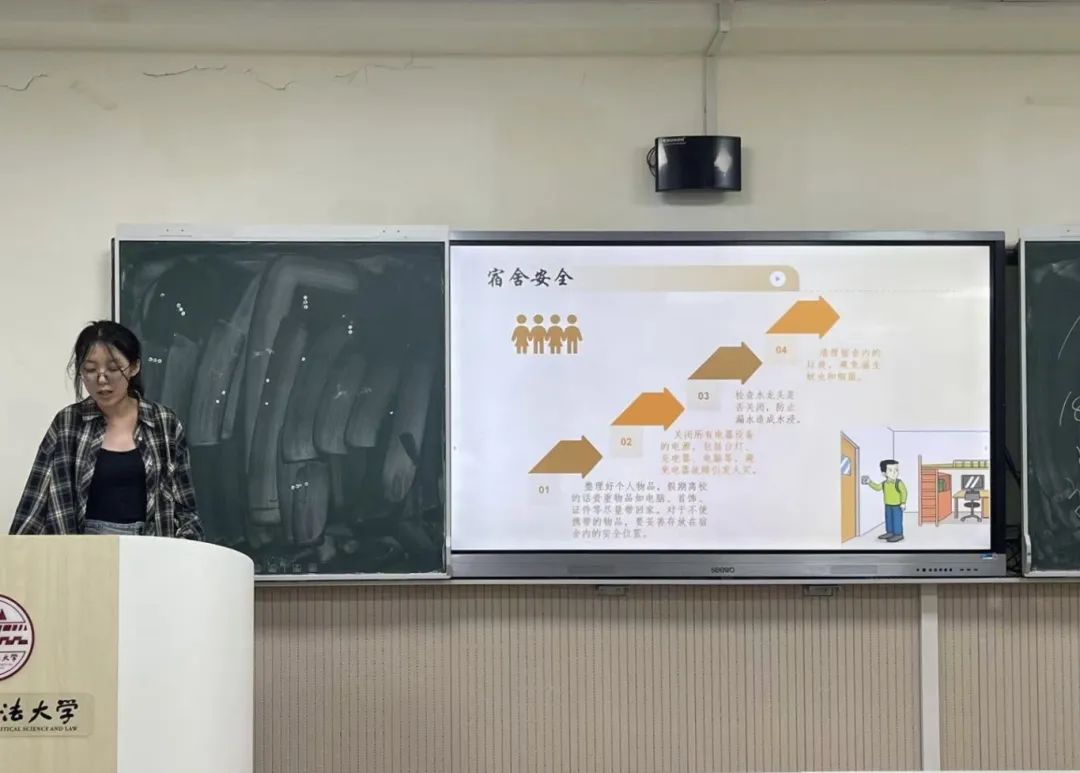 崔灿阳围绕安全教育普及与提升这一主题,分别从“交通安全”“宿舍安全”“饮食安全”“财物安全”四个方面展开讲解。通过对相关安全规则的详细讲解,提高学生的安全意识和安全防范能力。问答互动使大家对生活中的各种安全隐患有了更加深入的了解。