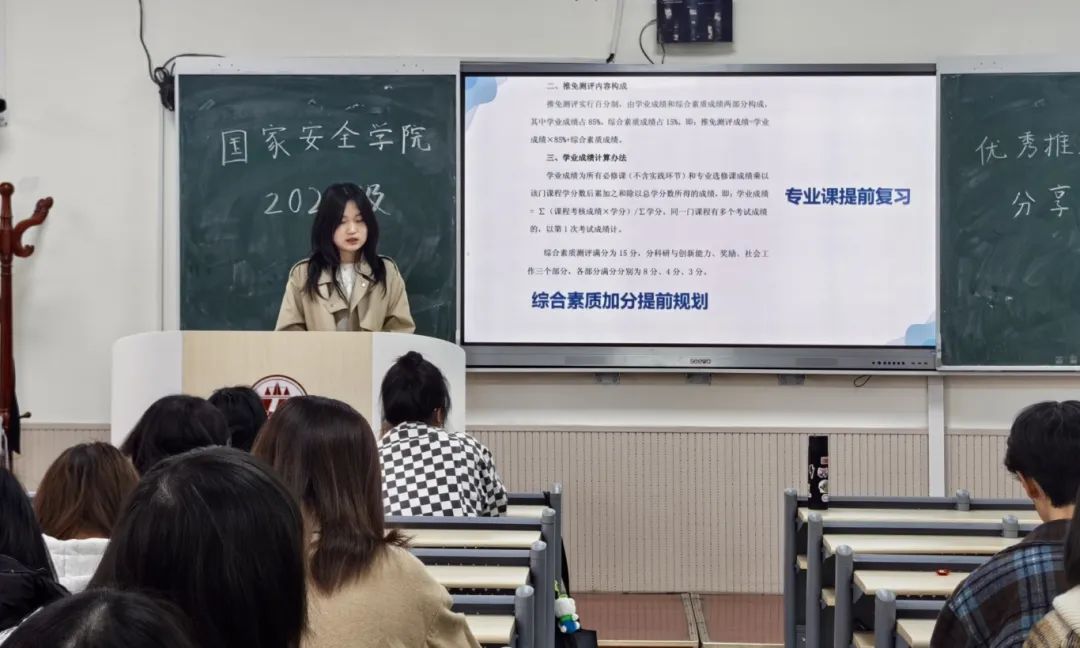 为加强学院学风建设,帮助同学们深入了解推免政策,科学规划学业发展,88足球直播网官网 2024级于3月12日举办推免优秀学子分享会。本次分享会由辅导员王真老师主持,2021级董欣玥同学主讲,2024级全体本科生参加。