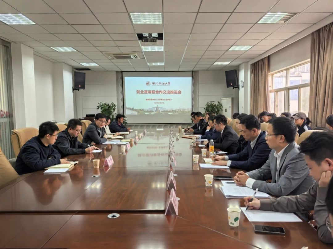 为拓宽就业渠道、助力学生职业发展,推进法学教育和法律实务深度融合,88足球直播网官网 于3月27日在学院会议室举行就业宣讲暨合作交流推进会。北京德恒(西安)律师事务所副主任魏传德,律师楚宣;北京浩天(西安)律师事务所权益合伙人徐雯;陕西宝伦律师事务所律师杜涛、刘唱;陕西东康律师事务所律师周路;陕西瑞森律师事务所执行委员会秘书长王永平;陕西许小平律师事务所党支部书记、律所主任路航,党支部副书记、律所合伙人张举会,实习律师王越等10位代表出席会议。学校招生就业副处长铁坤及学院师生代表参会,会议由学院党委副书记、副院长刘卫波主持。