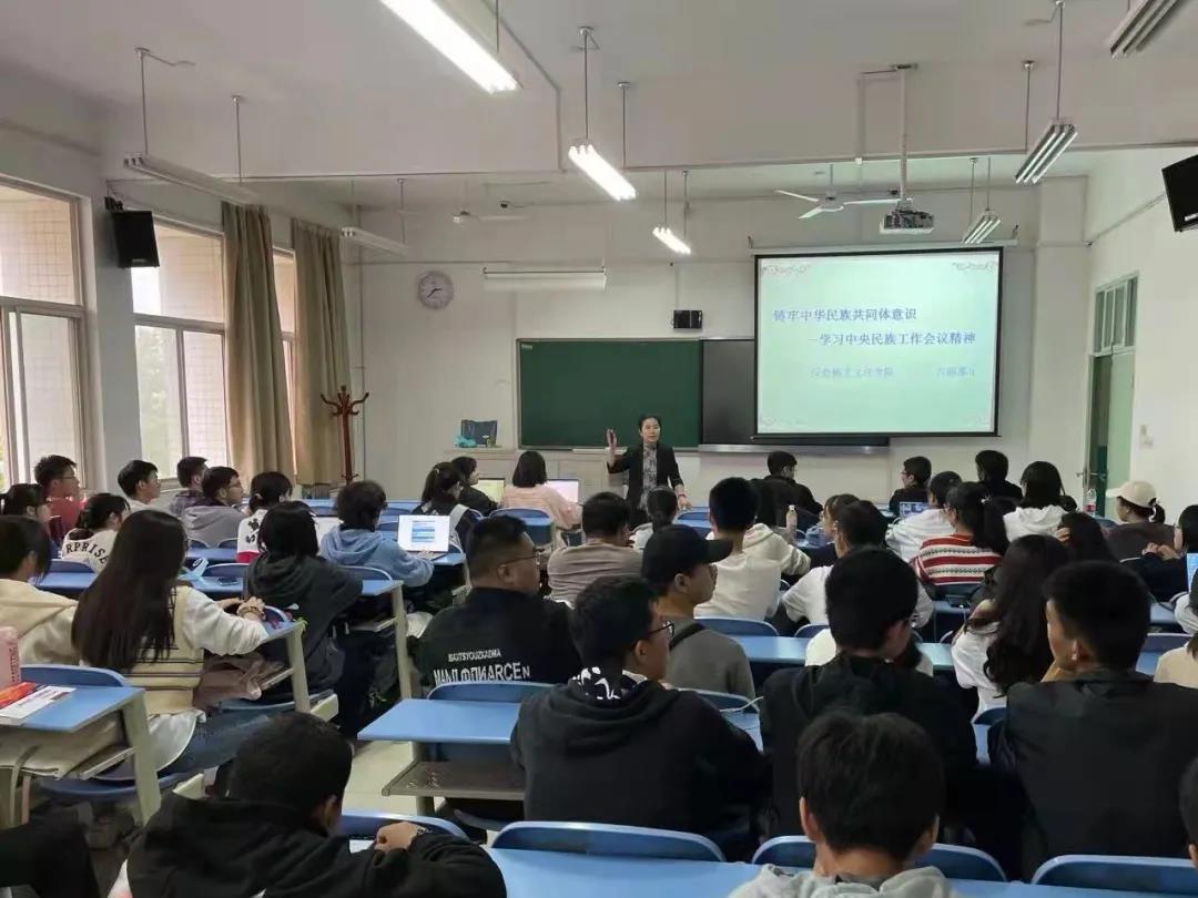 随后,古丽那尔老师详细介绍了我国少数民族的地区分布、人口数目、生存环境等,强调了党的民族、宗教政策的重要性、优越性并向全体同学讲述了我国民族政策的主要内容。古丽那尔老师在课堂上带领同学们回顾了各次中央民族会议。讲座的最后,老师向同学们发出了紧密团结在以习近平同志为核心的党中央周围,坚定不移走中国特色解决民族问题的正确道路,共创中华民族的美好未来的倡议。