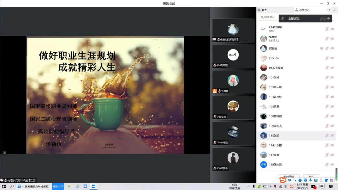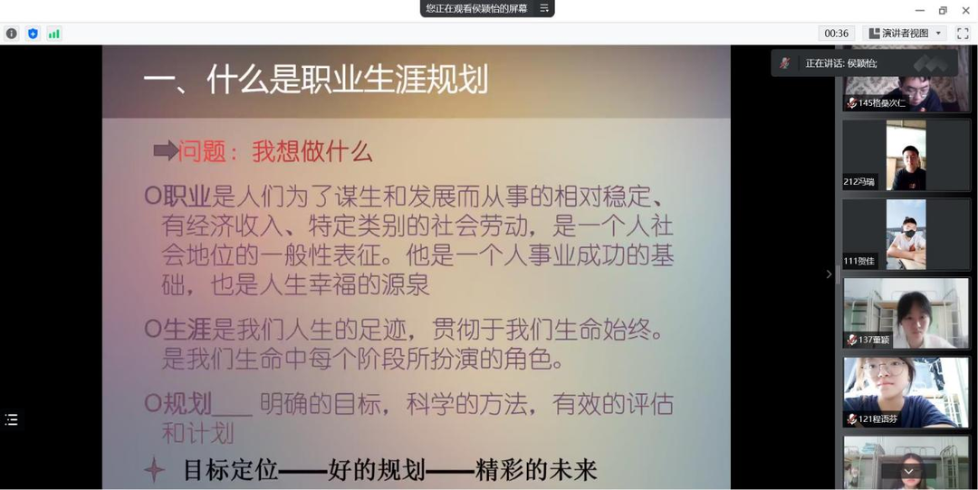 为帮助大学新生尽快适应大学生活,明确职业生涯规划的定义和方向,帮助新生树立目标,88足球直播 于9月9日上午9点整在腾讯会议召开2022级新生职业生涯规划与心理健康教育讲座。88足球直播 党委副书记、副院长侯颖怡副教授担任此次讲座主讲人,88足球直播 2022级辅导员张婕妮老师主持本次会议。本次讲座以“做好职业生涯规划,成就精彩人生”为主题,分别从大学生活的准备、职业生涯规划的定义、职业生涯规划的必要性以及途径等方面出发,帮助大家明确职业发展目标。