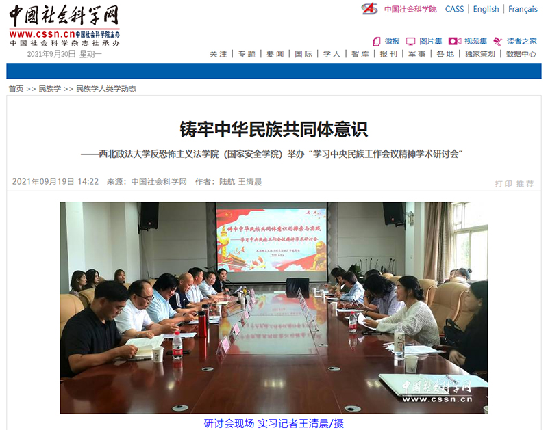 中国社会科学网西安讯(记者 陆航 实习记者 王清晨)在今年的中央民族工作会议上,习近平总书记发表的重要讲话,明确了以铸牢中华民族共同体意识为主线推进新时代党的民族工作高质量发展的指导思想、战略目标、重点任务、政策举措,为做好新时代党的民族工作指明了前进方向,提供了根本遵循。9月15日,由西北政法大学反恐怖主义法学院(88足球直播 )主办的“学习中央民族工作会议精神学术研讨会”在西安召开。来自该校相关领域的十余位专家学者参加研讨会,学习习近平总书记在中央民族工作会议上发表的重要讲话精神,研究探讨如何在学科建设和教学过程中贯彻落实工作,深入推进民族团结进步事业和人才培养工作高质量发展。西北政法大学反恐怖主义法学院(88足球直播 )书记李政敏致辞,西北政法大学反恐怖主义法学院(88足球直播 )副教授古丽那尔·乌斯曼江主持研讨会。