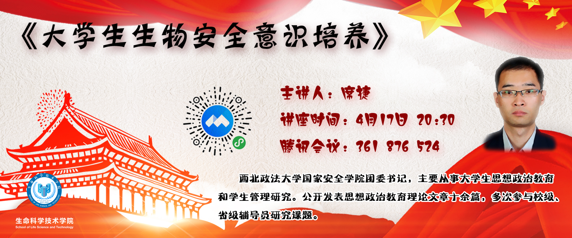 4月17日晚,西安电子科技大学生命科学技术学院邀请学院团委书记席捷老师作《大学生生物安全意识培养》专题线上报告。席捷老师首先从今年初的新冠疫情防控情况引入,讲述了总体国家安全观和生物安全的概念,结合流行病防控等现实事例阐释了生物安全作为国家安全的重要组成部分,与每个人息息相关。随后,席老师从当前生物安全面临的主要挑战、大学生生物安全教育的重要意义、以及如何培养大学生生物安全意识等方面进行了系统的讲解。