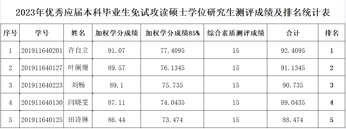根据《关于做好2023年优秀应届本科毕业生免试攻读硕士学位研究生推荐工作的通知》,经过广泛动员宣传,学生自愿申请,学院于2022年9月9日组织公开答辩及评定。经学院推免生遴选工作小组会议审核,现将2023年优秀应届本科毕业生免试攻读硕士学位研究生测评成绩及排名进行公示: