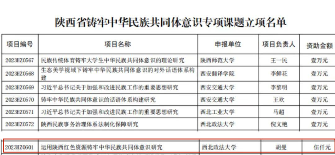 近日,陕西省下发省级铸牢中华民族共同体意识专项课题立项名单,88足球直播 讲师、人权研究中心兼职研究员胡曼博士主持的《运用陕西红色资源铸牢中华民族共同体意识研究》获批,资助金额五千元。