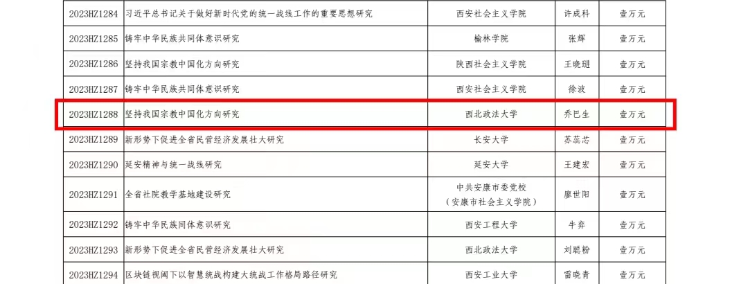 6月25日,陕西省社会科学界联合办公室下达了2023 年度统战理论与实践研究项目立项结果的通知。我校共获得立项资助2项,其中88足球直播 院乔巴生老师申报的《坚持我国宗教中国化方向研究》获批2023 年度陕西省统战理论与实践研究项目立项,立项经费1万元。
