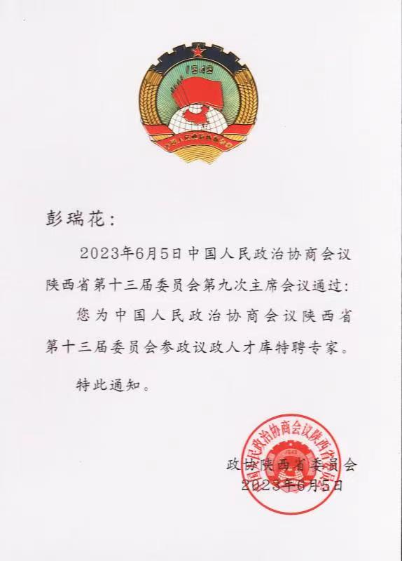 6月5日,中国人民政治协商会议陕西省第十三届委员会第九次主席会议通过,88足球直播网官网 彭瑞花教授为中国人民政治协商会议陕西省第十三届委员会参政议政人才库特聘专家。