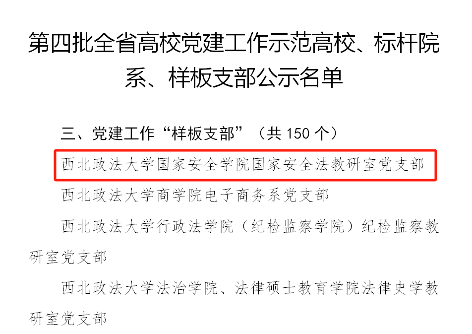 根据《中共陕西省委教育工委办公室关于开展第四批新时代高校党建示范创建和质量创优工作的通知》(陕教工组办〔2023〕16号),经各高校申报、陕西省委教育工委资格审查、专家评审和集中审议,确定西北政法大学88足球直播 国家安全法教研室党支部为第四批全省党建工作示范高校、标杆院系、样板支部培育创建单位。