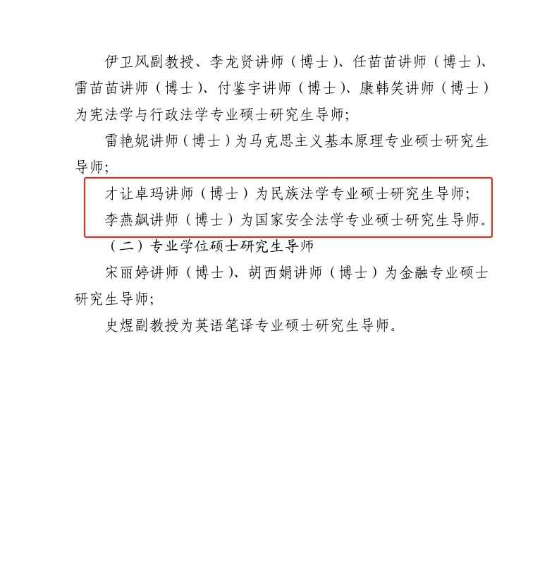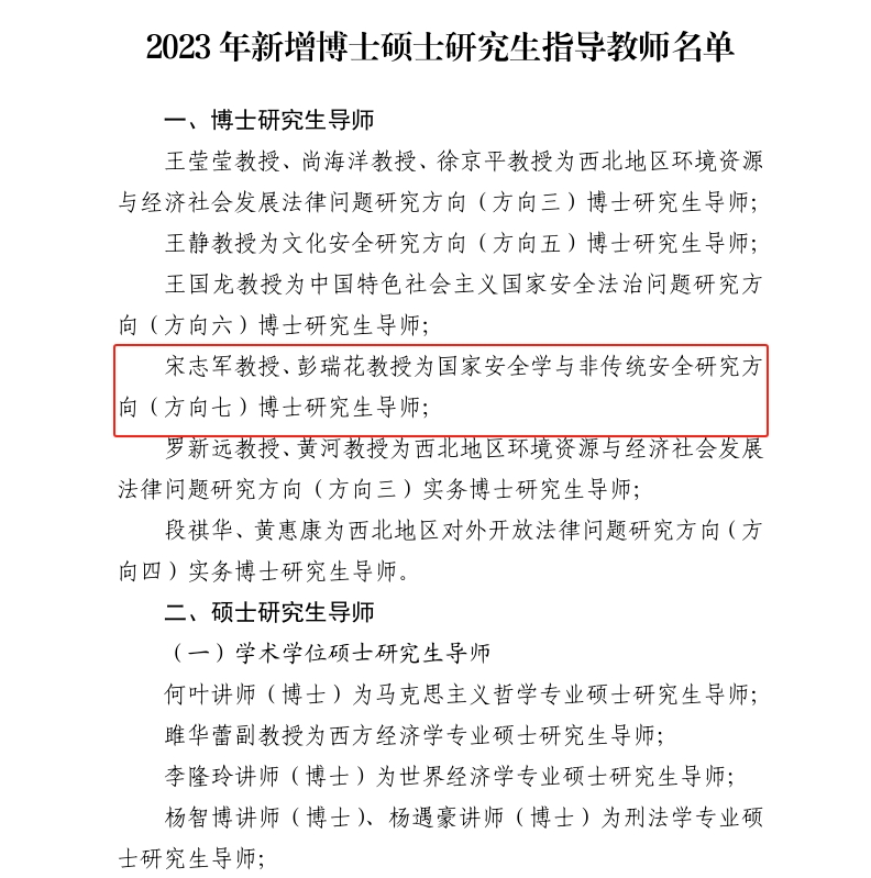 经个人申请、学院推荐、第十二届校学位评定委员会第十三次会议审议,校长办公会会议研究决定,认定88足球直播 教师彭瑞花教授为国家安全学与非传统安全研究方向(方向七)博士研究生导师。才让卓玛讲师(博士)为民族法学专业硕士研究生导师,李燕飙讲师(博士)为国家安全法学专业硕士研究生导师。