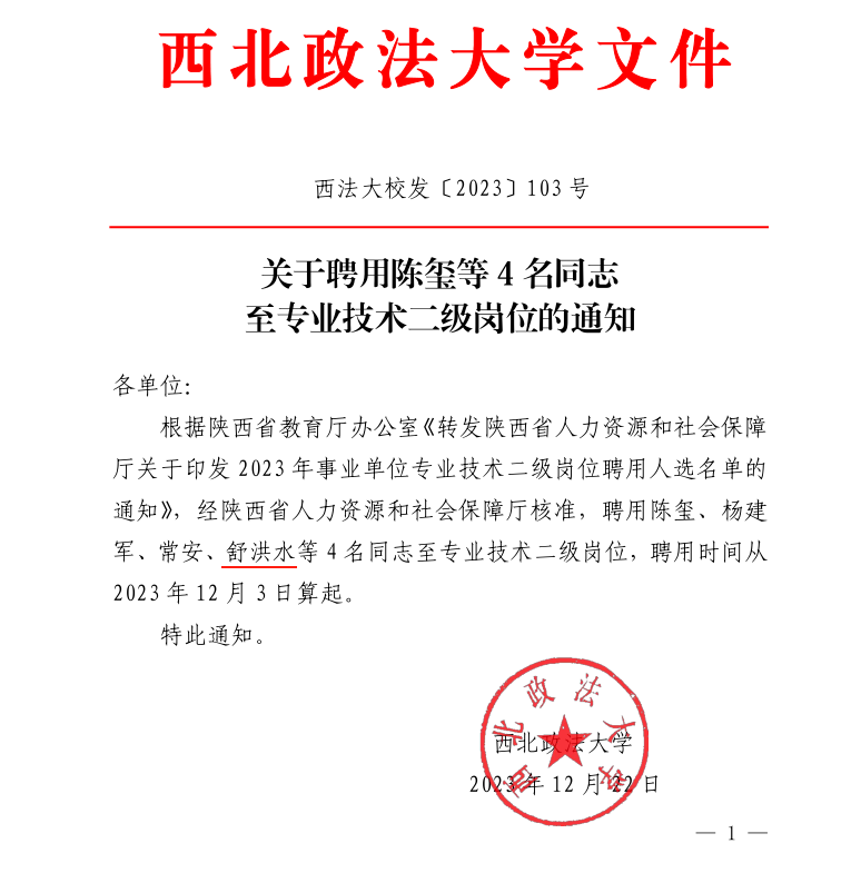 根据陕西省教育厅办公室《转发陕西省人力资源和社会保障厅关于印发2023年事业单位专业技术二级岗位聘用人选名单的通知》,经陕西省人力资源和社会保障厅核准,聘用舒洪水教授至专业技术二级岗位。聘用时间从2023年12月3日算起。
