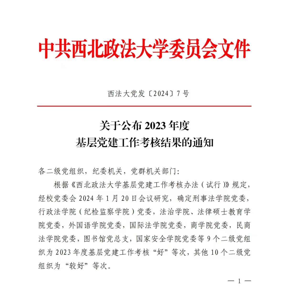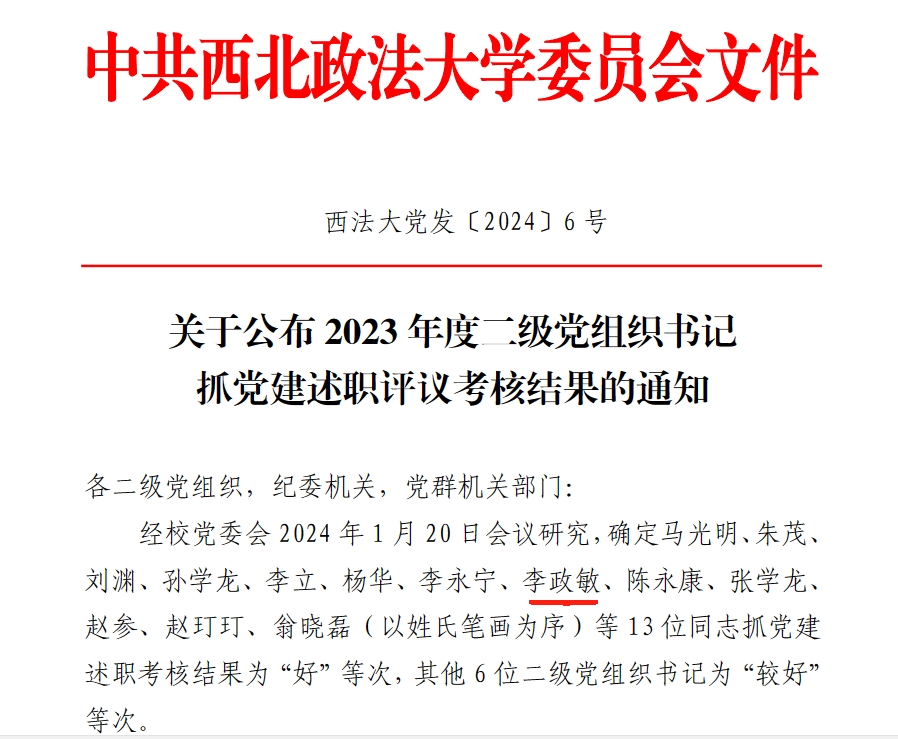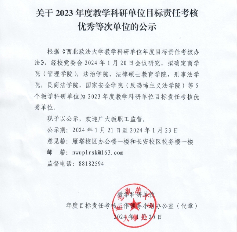 根据《西北政法大学教学科研单位年度目标责任考核办法》,经校党委会2024年1月20日会议研究,拟确定商学院(管理学院),法治学院、法律硕士教育学院,刑事法学院,民商法学院,88足球直播 (反恐怖主义法学院)等5个教学科研单位为2023年度教学科研单位目标责任考核优秀单位。