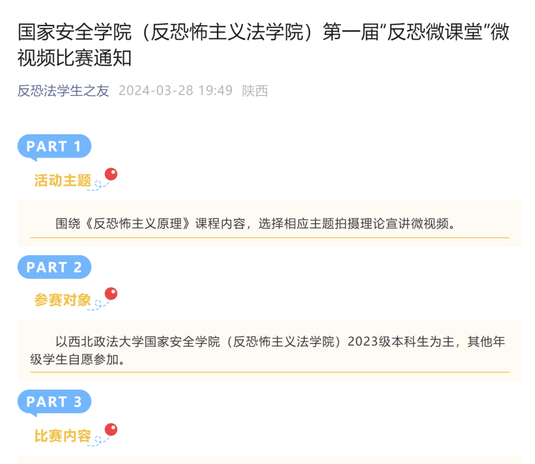 学院坚持党建为引领,统筹开展国家安全教育,学院党委于3月初认真研究制定年度国家安全日系列活动方案,并统筹推进西北政法大学第七届国家安全知识竞赛及国家安全教育进学校、进社区、进乡村、进企业等系列活动开展。学院党委、行政党支部、教师及学生党支部分别开展学习习近平总书记关于总体国家安全观的重要论述活动,深入领会核心要义和实践要求。学院行政党支部、学生党支部与渭南市三张镇铁王村党支部联合开展国家安全教育主题党日活动,将国家安全教育与新农村建设相结合,持续扩大国家安全教育覆盖面。在学院党委的指导下,学院国家安全教育宣讲团、红色文化宣讲协会等社团组织开展学习贯彻总体国家安全观的研讨活动;在外国语学院、西北政法大学国旗护卫队、万科城初级中学等开展国家安全教育宣讲活动,积极宣传国家安全法、保守国家秘密法、网络安全法等法律法规,引导学生增强国家安全意识,自觉维护国家安全。