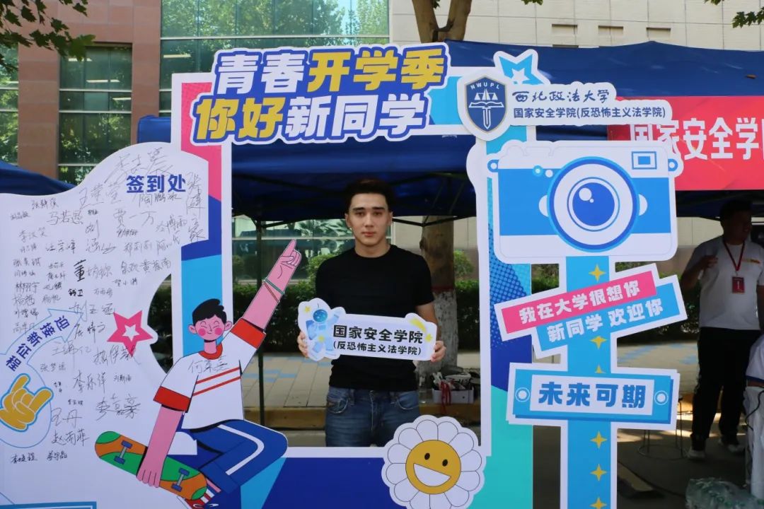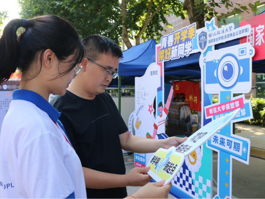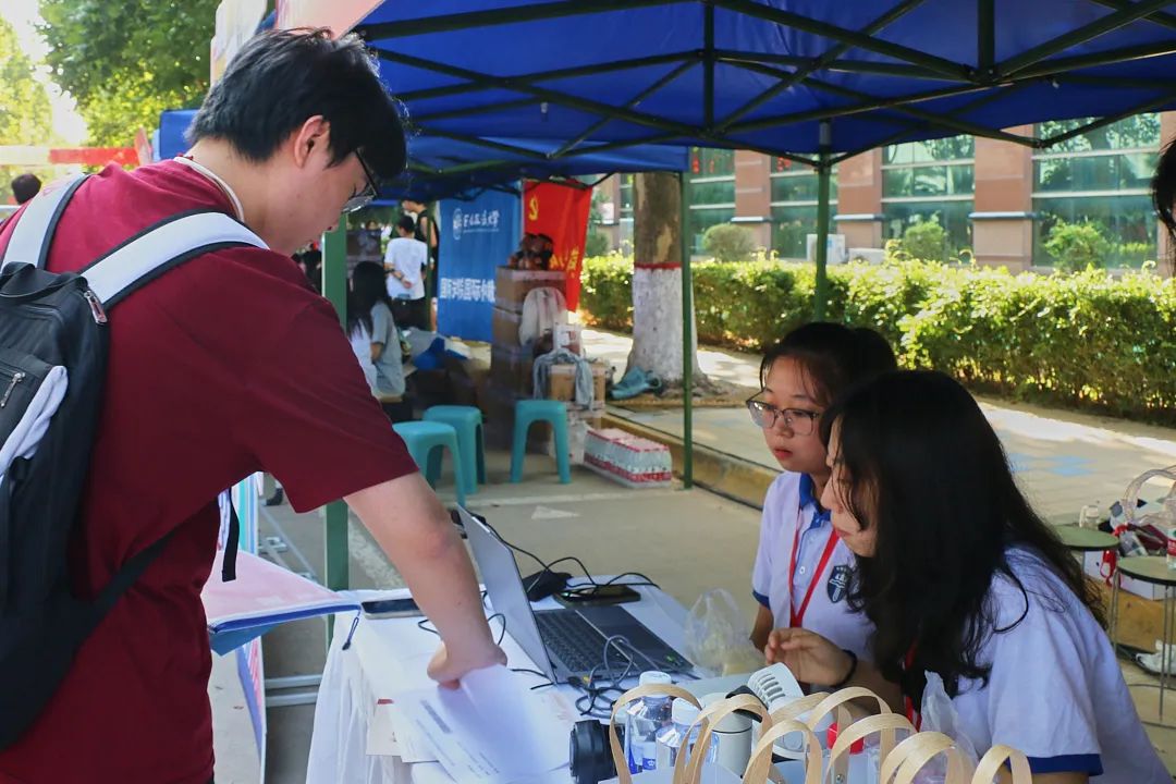 来到迎新摊位前