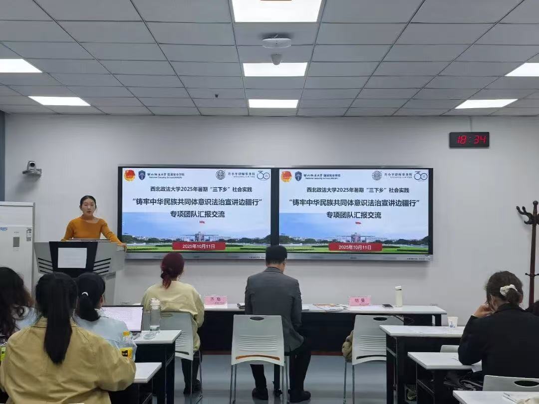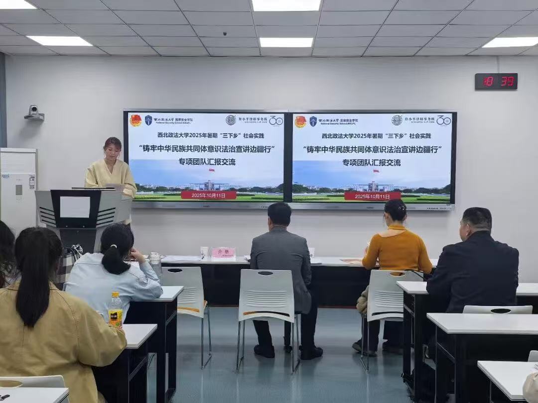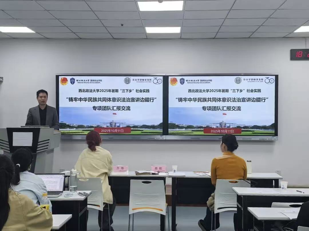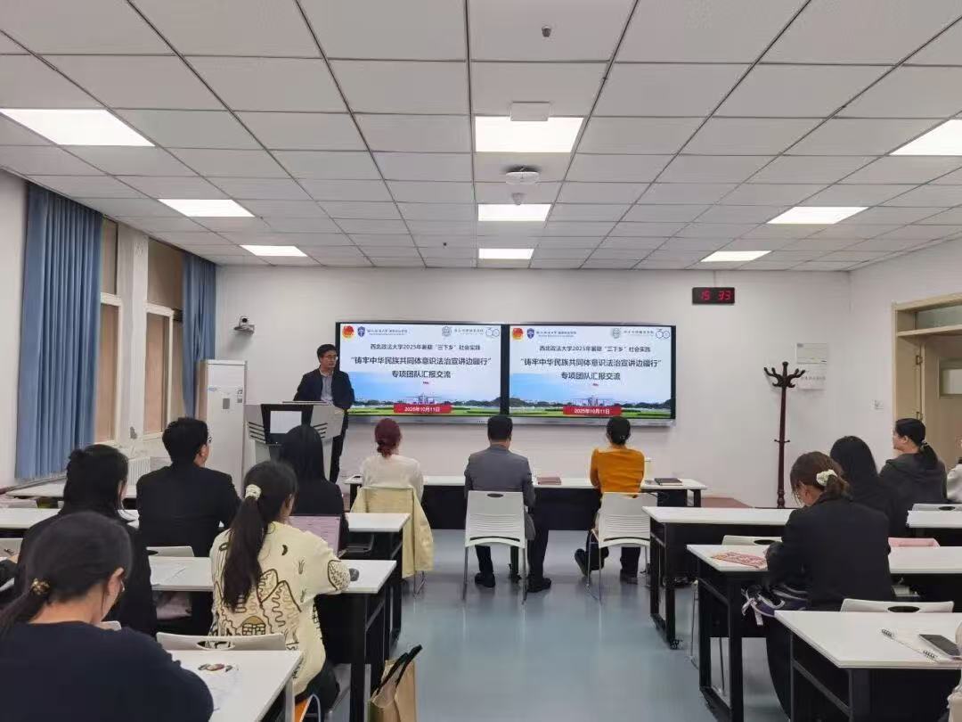为全面总结2025年暑期“三下乡”社会实践“铸牢中华民族共同体意识法治宣讲边疆行”专项团队的实践成果,加强各团队间的交流与学习,西北政法大学88足球直播 于10月11日在正心楼302教室召开社会实践汇报交流会。活动邀请许小平律师事务所主任路航、88足球直播 副教授胡曼老师、校团委创新实践部部长齐格老师担任评委。学院党委书记李政敏、副书记刘卫波、团委书记杨柳、团委副书记张婕妮参加活动。