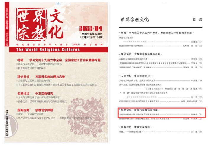 该文刊发于《世界宗教文化》2022年第4期。文章从理念、制度和成效等方面,对新时代宗教治理的重大创新进行了深入研究,并结合我国现阶段在该领域工作中面临的严峻挑战,以提高政治站位、全面构建宗教治理“四重格局”、完善宗教治理法律体系、以基层宗教治理为切入点、充分运用大数据手段等方面提出现实完善路径。
