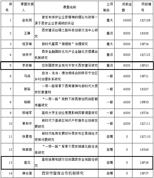 积极组织申报西安市社会科学规划基金课题。经西安市社科规划基金办组织相关专家对2018年度西安市社科规划基金申报课题进行了评审。本次评审采取学科组对活页进行匿名评审(委托项目通过会议评审)的办法,并经市社科规划基金领导小组同意,确定了2018年度西安市社科规划立项课题。