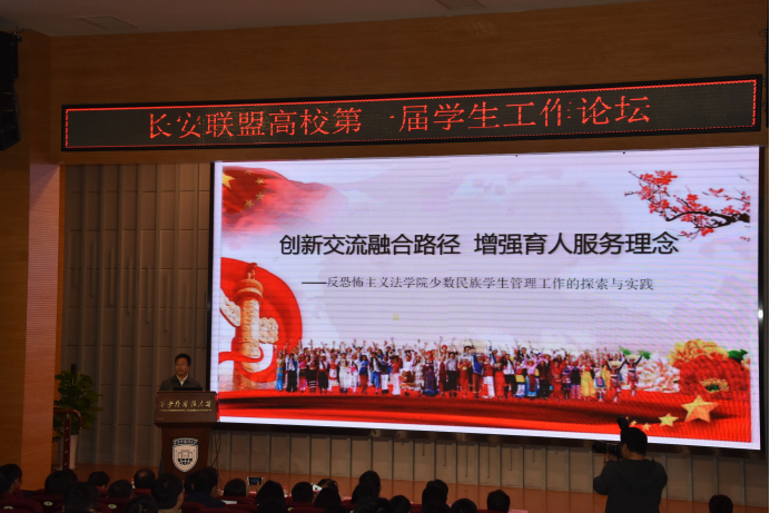 4月24日上午,长安联盟高校第一届学生工作论坛在西安外国语大学隆重举行。本次论坛以“深入学习习近平新时代中国特色社会主义思想,努力提升高校学生思想政治教育工作质量”为主题,分别邀请西北政法大学、陕西师范大学、西北大学、西安邮电大学、西安财经学院、西安美术学院等校学工干部参加。我校二十余名学工干部和辅导员参加此次论坛。