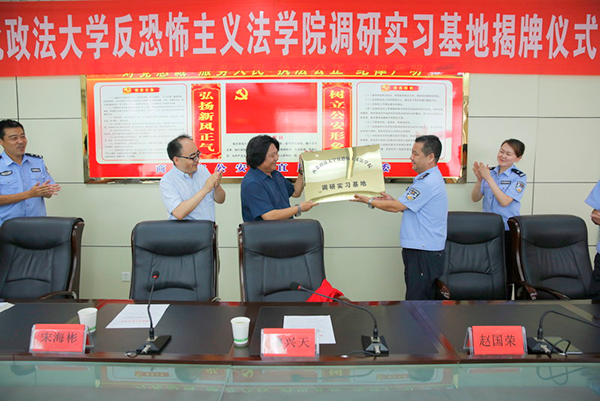 7月13日,反恐怖主义法学院院长穆兴天教授和宋海彬副教授赴商洛市公安局安排2015级学生实习工作,当天下午4点,在商洛市公安局政治部主任赵国荣主持下,与商洛市公安干警座谈,并举行了调研实习基地的揭牌仪式。