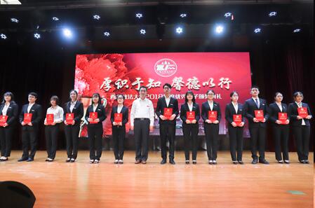 6月6日下午,厚识于知,馨德以行——西北政法大学2018年度优秀学子颁奖典礼在长安校区满天星学术报告厅隆重举行。校长杨宗科、校党委副书记赵健、副校长张军政出席颁奖典礼。“瑾熙”奖学金设立者、企业家陆泽质先生,“海伦”奖学金设立者张竹英、朱延通夫妇,“大泽、怡亚通”奖学金设立者聂峰辉校友,“潇湘”助学金设立方、湖南校友会张敬东校友,渔女奖助学金设立方、珠海校友会陆星洲校友,相关职能部门负责人,各学院学生工作负责人,全体辅导员,首届最受学生喜爱的老师代表,家长代表以及获奖学生代表共计500余人参加了颁奖典礼。
