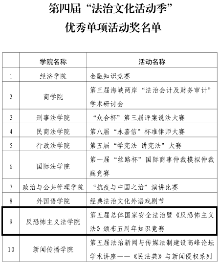经学院申报,学校职能部门组织评审,由88足球直播网官网 举办的第五届总体国家安全法治暨《反恐怖主义法》颁布五周年知识竞赛活动荣获第四届“法治文化活动季”优秀单项活动奖。
