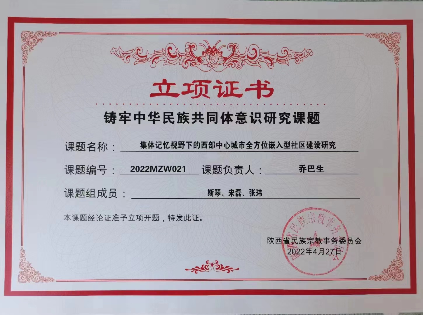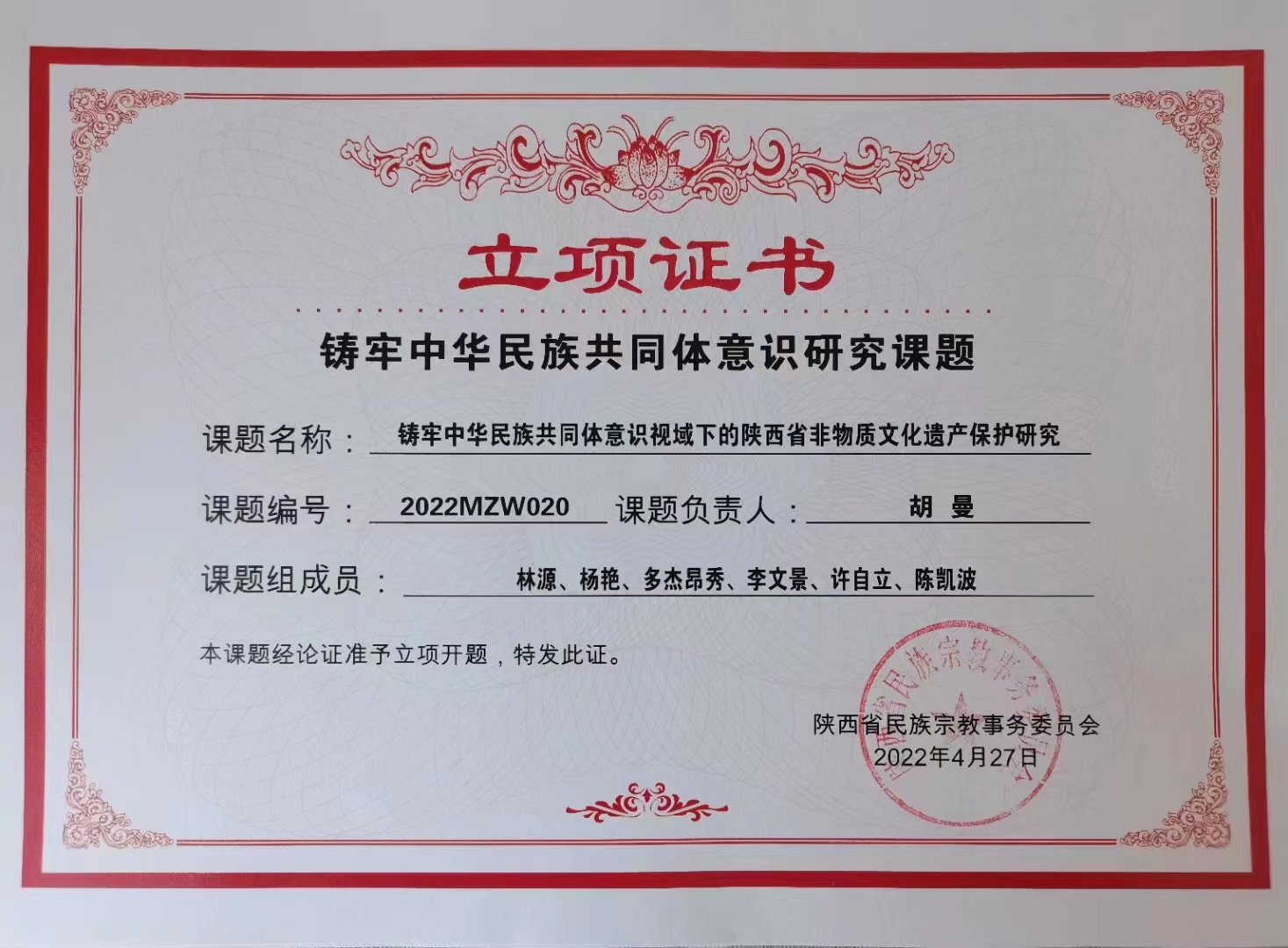 近日,反恐法学院胡曼博士、乔巴生博士主持的课题“铸牢中华民族共同体意识领域下的陕西省非物质文化遗产保护研究”、“集体记忆视野下的西部中心城市全方位嵌入型社区建设研究”获批立项。