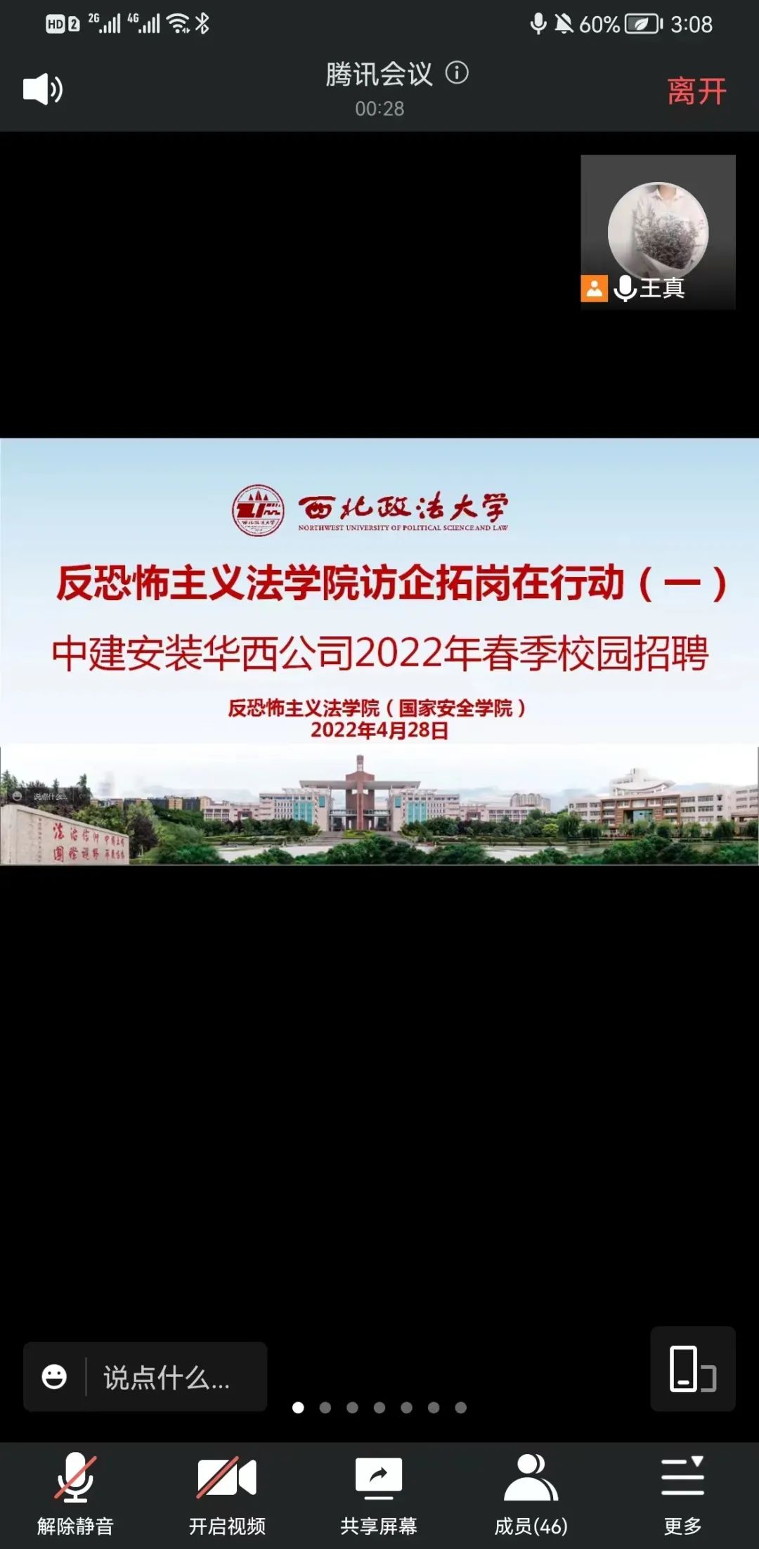 为贯彻落实党中央、国务院“稳就业”“保就业”、《“十四五”就业促进规划》决策部署,落实教育部、省教育厅关于做好 2022届毕业生就业创业工作的相关要求,深入推进88足球直播网官网 2022届毕业生顺利就业,88足球直播网官网 于4月28日在反恐法学院会议室举行了中建安装华西公司2022年春季专场招聘会。西北政法大学副校长王健、学院党委书记李政敏、院长舒洪水、副书记侯颖怡、副院长王东明参加。我校杰出校友,中建安装华西公司干部人事部副部长李强带着10余岗位参加了现场招聘宣讲会。会议采取线上线下相结合的方式,88足球直播网官网 近100名毕业生参加了宣讲,活动还吸引了政治与公共管理学院等其他学院毕业生参加。会议由党委书记李政敏主持。