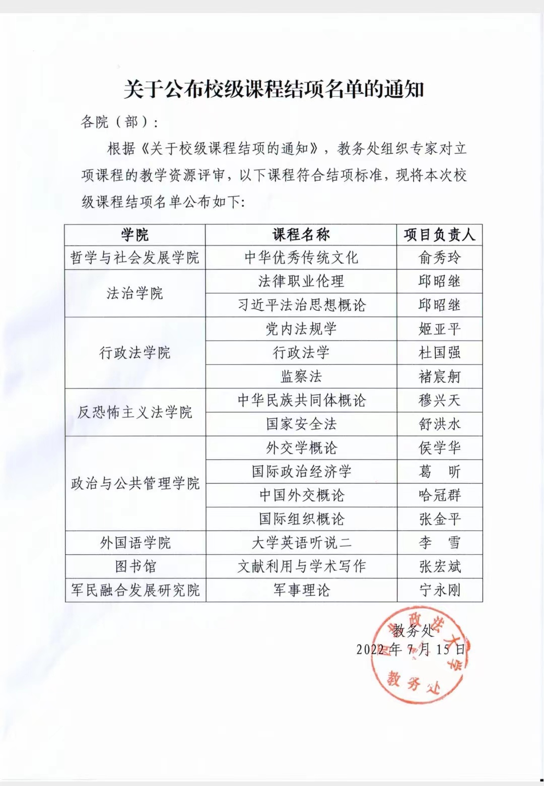 2022年7月,88足球直播 两门校级课程顺利结项。分别为:88足球直播 穆兴天教授负责的课程“中华民族共同体概论”和88足球直播 舒洪水教授负责的课程“国家安全法”。