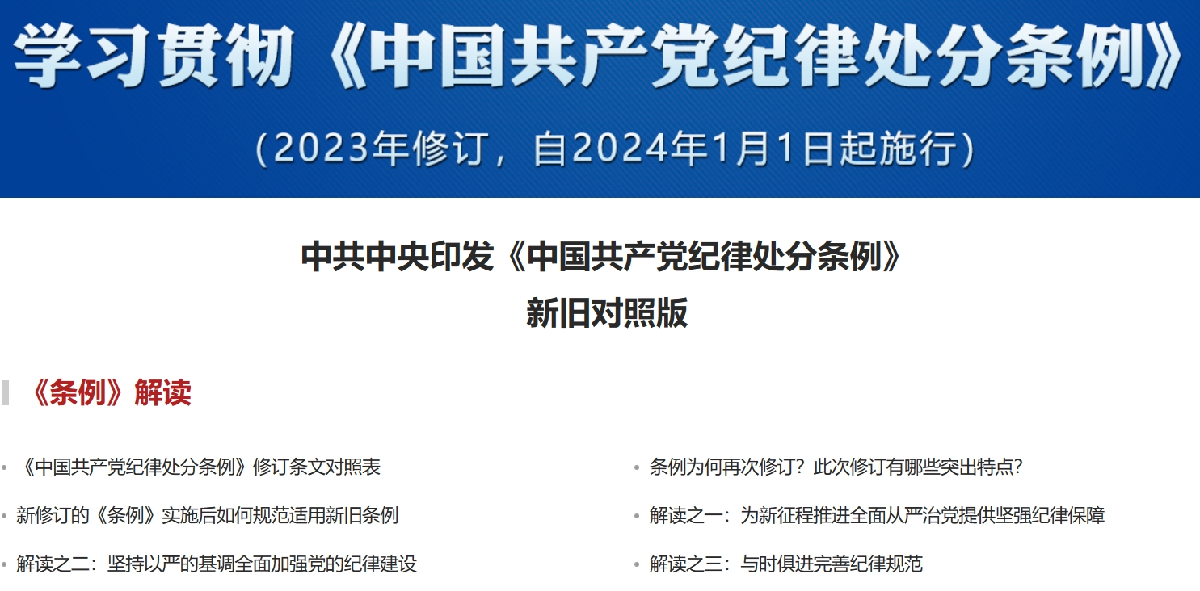 近日,中共中央印发了修订后的《中国共产党纪律处分条例》(以下简称《条例》),并发出通知,要求各地区各部门认真遵照执行。 通知指出,党的二十大对全面加强党的纪律建设作出战略部署。党中央着眼解决大党独有难题、健全全面从严治党体系,对《条例》作了修订。《条例》全面贯彻习近平新时代中国特色社会主义思想和党的二十大精神,从党章这个总源头出发,坚持严的基调,坚持问题导向和目标导向相结合,与时俱进完善纪律规范,进一步严明政治纪律和政治规矩,带动各项纪律全面从严,释放越往后执纪越严的强烈信号,发挥纪律建设标本兼治作用,为以中国式现代化全面推进强国建设、民族复兴伟业提供坚强纪律保障。 通知要求,各级党委(党组)要担负起全面从严治党政治责任,认真抓好《条例》的贯彻执行,对违反党纪的问题,发现一起坚决查处一起,切实维护纪律的刚性、严肃性。要坚持党性党风党纪一起抓,把《条例》纳入党员、干部培训必修课,增强遵规守纪的自觉。要坚持把纪律挺在前面,促进执纪执法贯通,准确运用“四种形态”,落实“三个区分开来”,把从严管理监督和鼓励担当作为高度统一起来。各级纪委(纪检组)要认真履行党章赋予的职责,强化监督执纪问责,敢于善于斗争,严格执纪、精准执纪,不断推动全面从严治党向纵深发展。各地区各部门在执行《条例》中的重要情况和建议,要及时报告党中央。 中共中央印发《中国共产党纪律处分条例》 新旧对照版