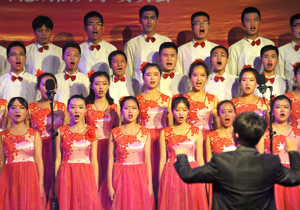 在法律硕士教育学院的深情演绎后,如花一样美丽的反恐法姑娘们身着红色的俏皮短裙,头戴鲜艳的花朵,迈着整齐的步伐,走向舞台中央。男生们则身着白色短袖,佩戴红色领结,雄姿英发,帅气逼人。在倾情演绎完高亢激昂的的《西北政法大学校歌》后,自选歌目《山丹丹开花红艳艳》曲调明亮,旋律优美,领唱的女高音歌声婉转悠扬,好似黄莺出谷,令人惊叹。唱到激情澎湃时,女孩们互相深情凝望,男孩们则缓缓举起了手中的玫瑰,在他们的眼中,仿佛真的看到了娇艳欲滴的花朵和广袤崎岖的黄土高坡。那高亢的音符,令人沉思革命的艰辛不易,那婉转的倾诉,让人产生发自内心的共鸣。合唱指挥手势优美,起拍收拍自如有力度,时而铿锵有力,虎虎生风;时而深情款款,行云流水。