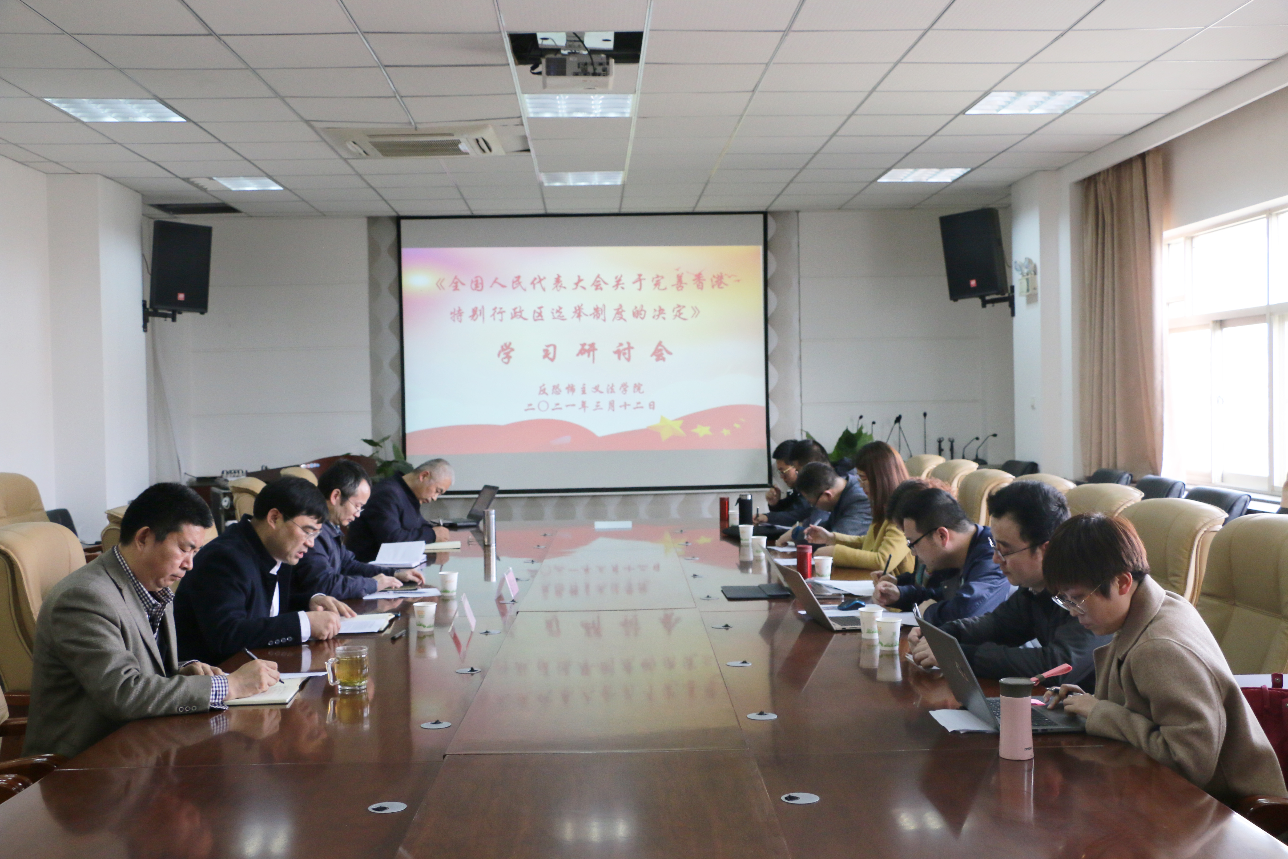 3月12日,反恐怖主义法学院在学院会议室召开学习《全国人民代表大会关于完善香港特别行政区选举制度的决定》座谈会。学院党政负责同志、教师代表、我校部分博士研究生、硕士研究生共30余人参加会议。会议由副院长王东明主持。
