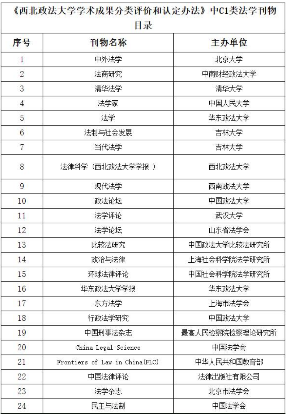 中国法学创新网于2024年6月17日更新了中国法学核心科研评价来源期刊(CLSCI)目录(2024年),共计27本。为促进我校法学学科发展,鼓励教师成果产出,经2024年9月5日学术委员会审议、2024年9月27日校长办公会讨论决定,将中国法学核心科研评价来源期刊(CLSCI)目录中的《China Legal Science》、《Frontiers of Law in China》、《法学杂志》、《中国法律评论》、《民主与法制》5种刊物调整到《西北政法大学学术成果分类评价和认定办法》的C1类法学刊物目录。目前,我校C1类法学刊物目录共24种刊物(见附表)。科研处在成果认定工作中,《民主与法制》从2024年第18期开始起算,其他4种刊物从2024年第1期开始起算。