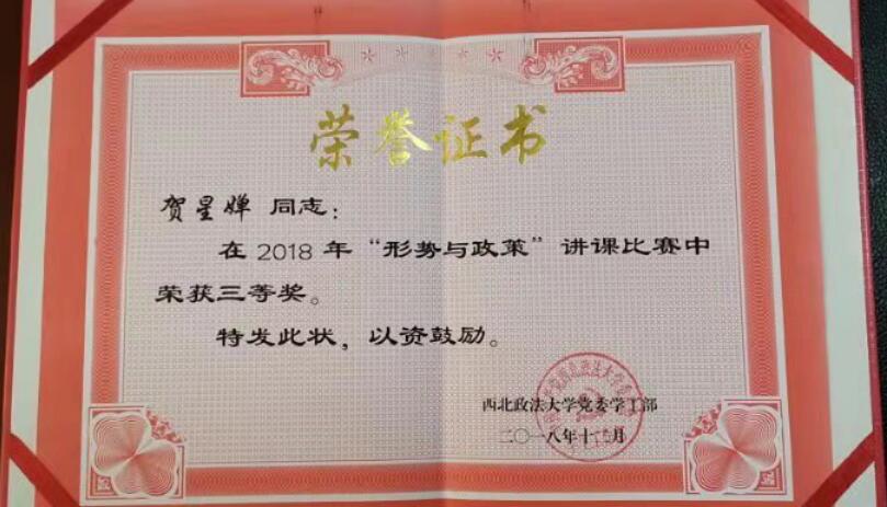 3月6日,西北政法大学2019年学生工作会议在校务楼二楼报告厅召开。校党委学工部对上一学年学生工作表现突出的人员进行表彰。反恐法学院团委书记席捷荣获2017-2018学年优秀辅导员,2017级辅导员贺星婵荣获第一届形式与政策讲课比赛三等奖。